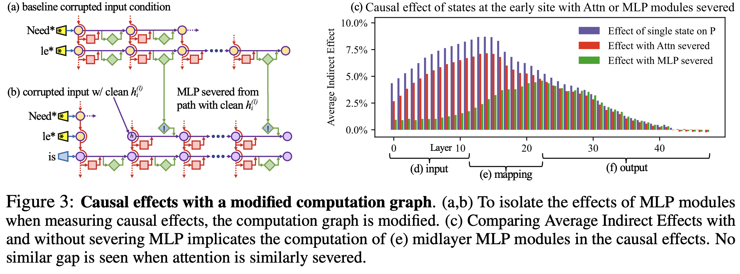 Abstract autoregressive transformer language model(LM)에서 factual associations(사실 관계)를 저장하는 장소와 이를 기억해내는 능력을 분석 causal intervention(= causal tracing): LM 내 어떤 module(= neural activations, layers, NN)이 model이 사실관계를 예측할때 결정적인 역할을 하는가?를 분석하기 위한 실험 결과를 통해 model의 중간 layer 내에 있는 feed-forward layers(MLP)가 subject tokens를 처리 할 때 하는 연산(computations)이 target(=object)를 prediction 할 때 영향을 끼치는 것을 밝혀 냄 이 compu..